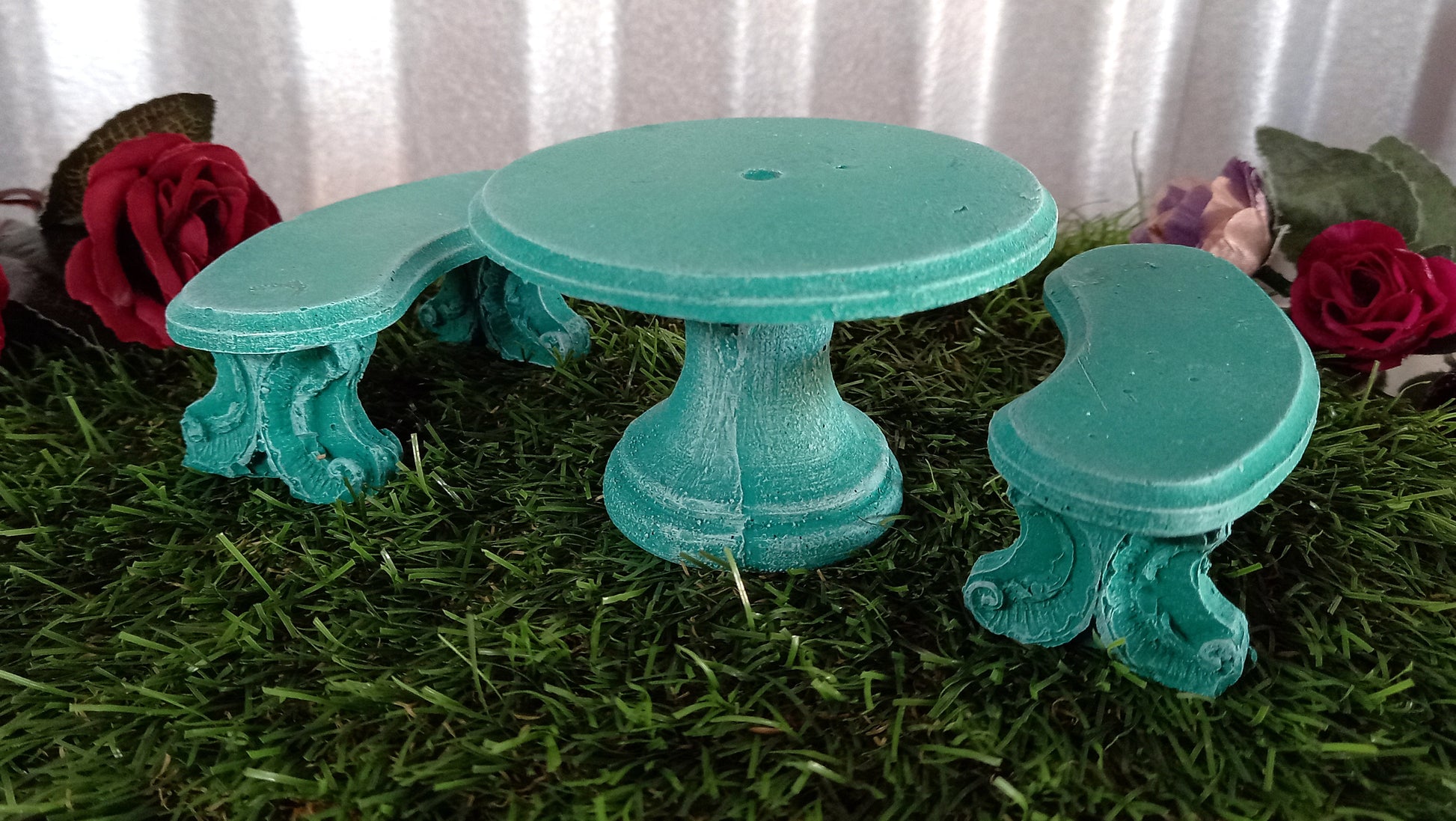 Bench : 10cm X 5cm X 4cm Table : 9cm X 9cm X 6cm Available Colours : Grey , Green , Pink Consists of 1 x Round Table and 2 x Benches